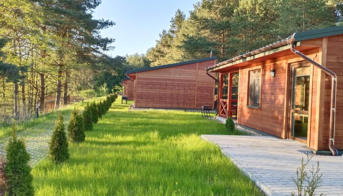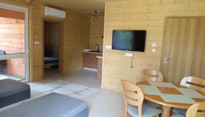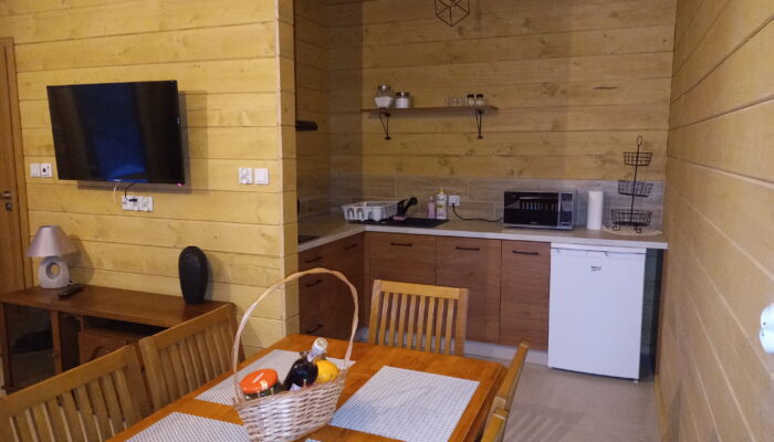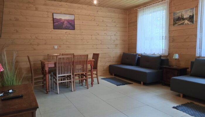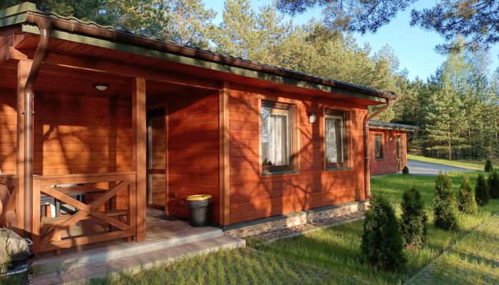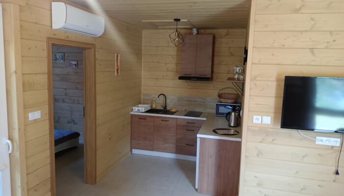 Na wyposażeniu domków :telewizor, lodówka, czajnik, kuchenka indukcyjna, mikrofalówka, naczynia, garnki, Wi-Fi, grill (węgiel we własnym zakresie). Domki klimatyzowane.