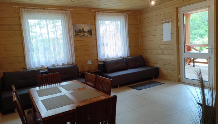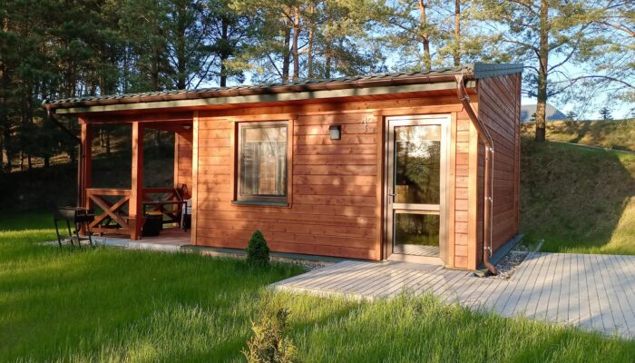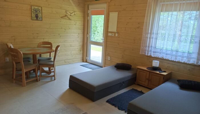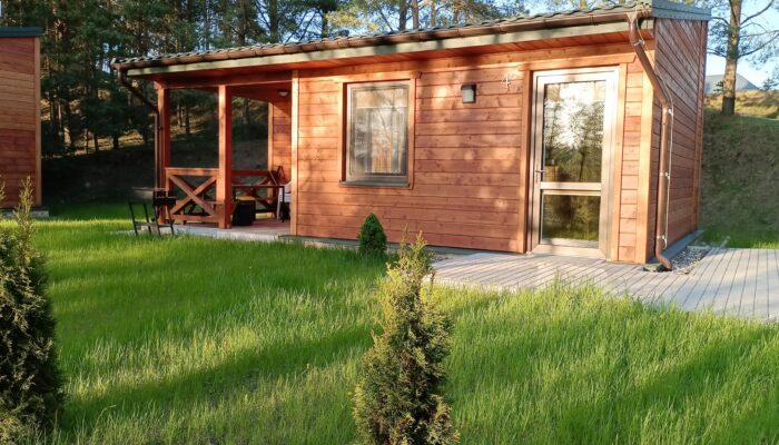 Domki z tarasem (45m2 + 9 m2- taras). Domki składają się z salonu z kuchnią, sypialni i łazienki